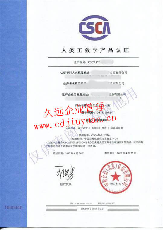 人類工效學(xué)產(chǎn)品認(rèn)證證書